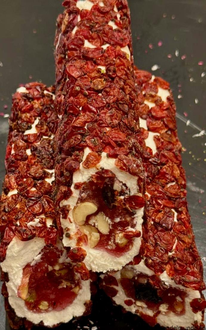 Aquí tenemos: copos de pistacho, almendras tostadas, cereales de chocolate, cereales mora, frutos rojos y ácidos Zereshk y Kadaif (masa filo en forma de fideos tostados)